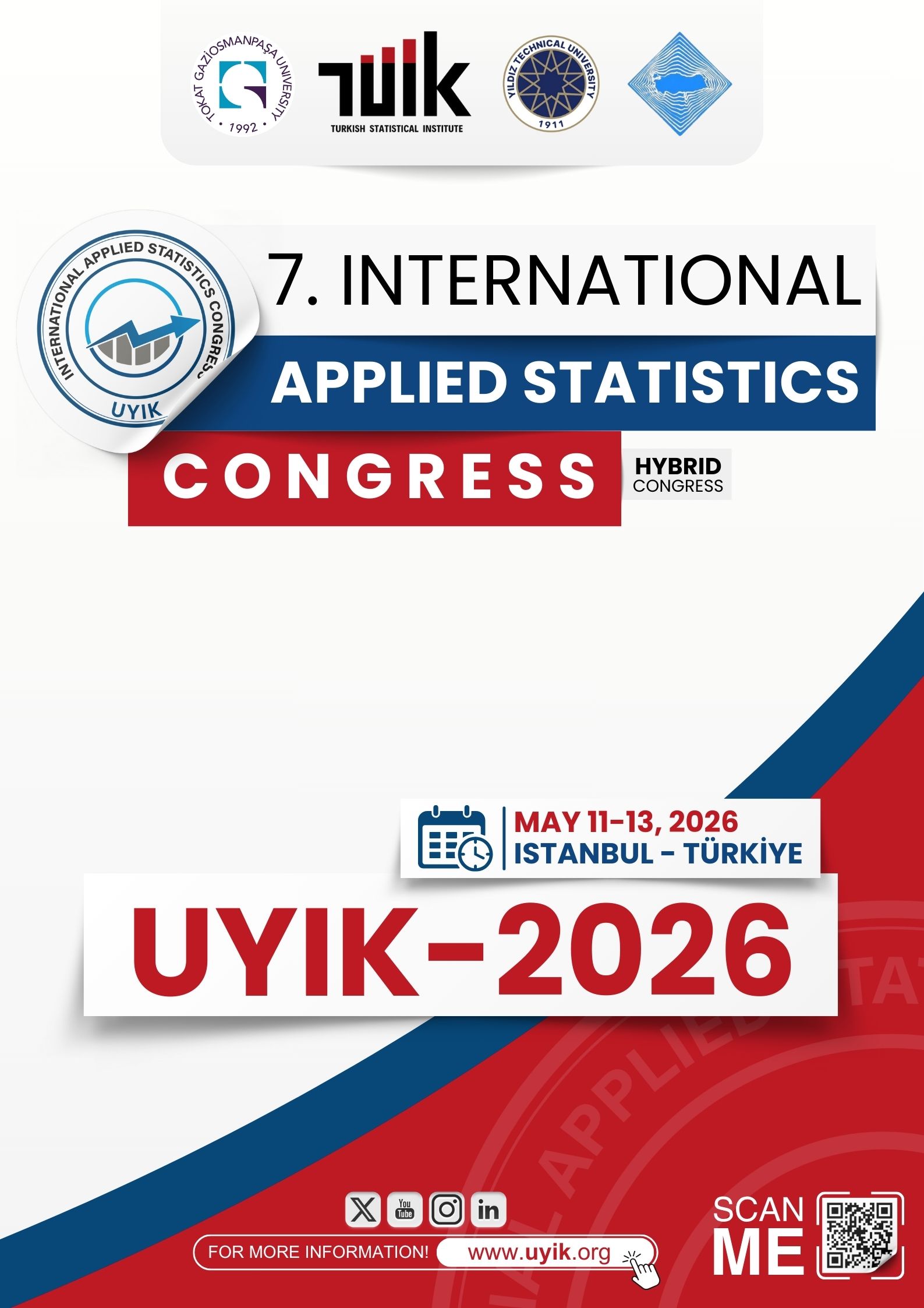 We are pleased to invite you to the 7th International Congress on Applied Statistics (UYİK 2026), which aims to discuss the most recent developments in the theory and practice of statistics, share innovative methodologies and interdisciplinary applications, and strengthen academic–industry collaborations.